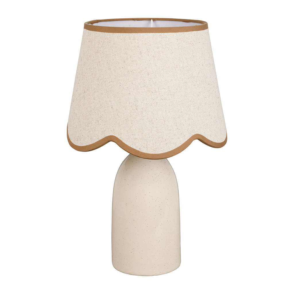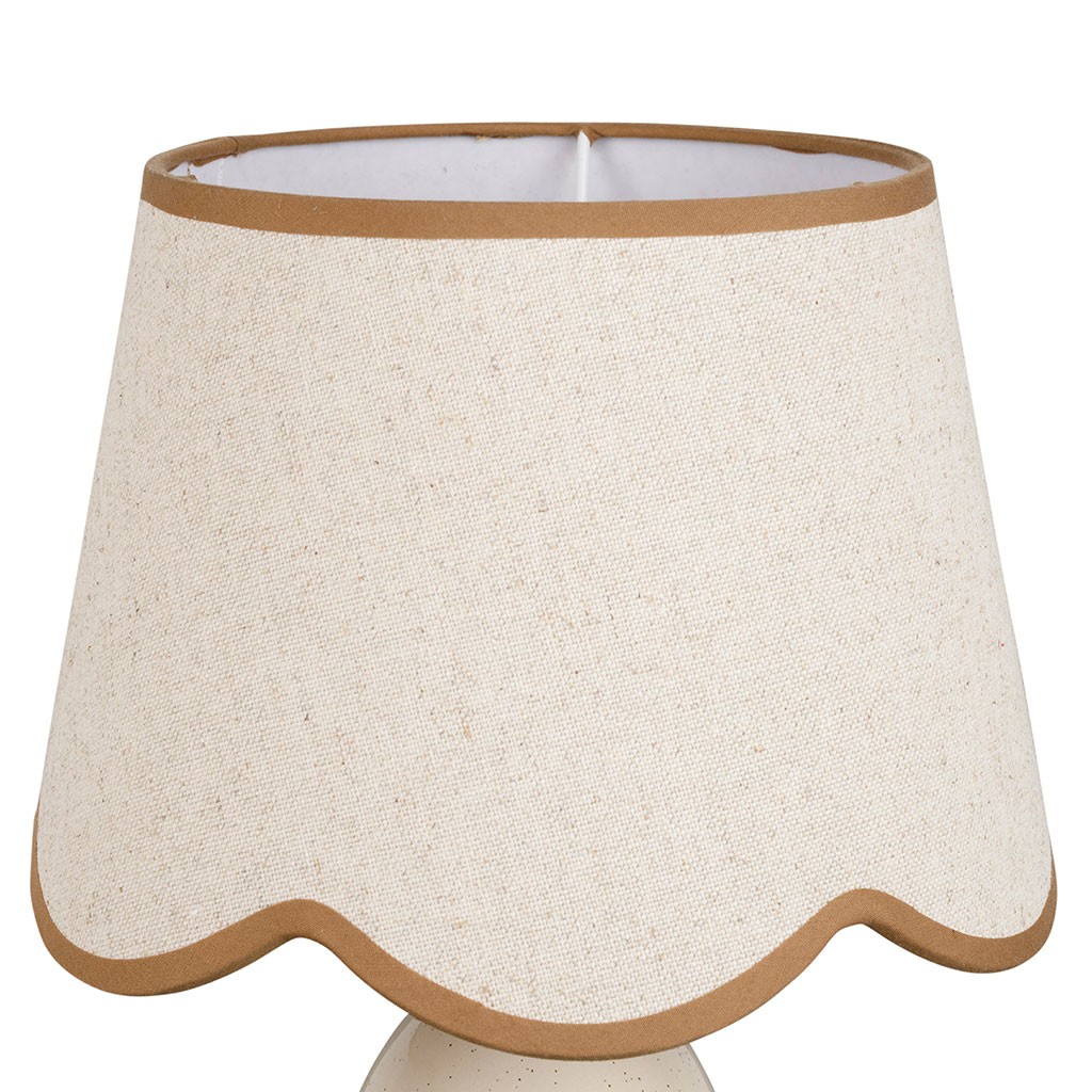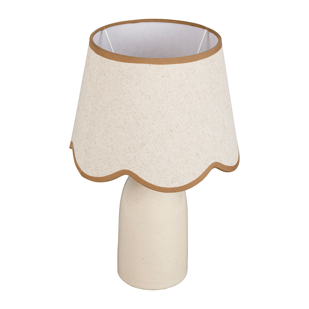 Son pied en céramique claire s'harmonise parfaitement avec l'abat-jour en lin assorti, dont la découpe en vagues apporte une subtile originalité sans alourdir le design.