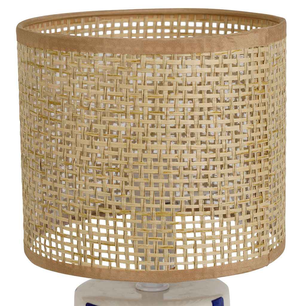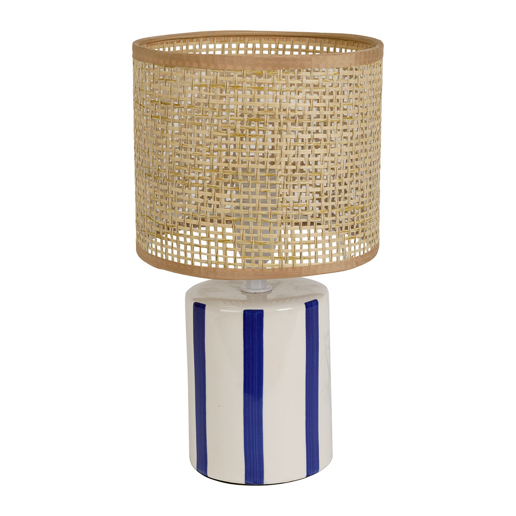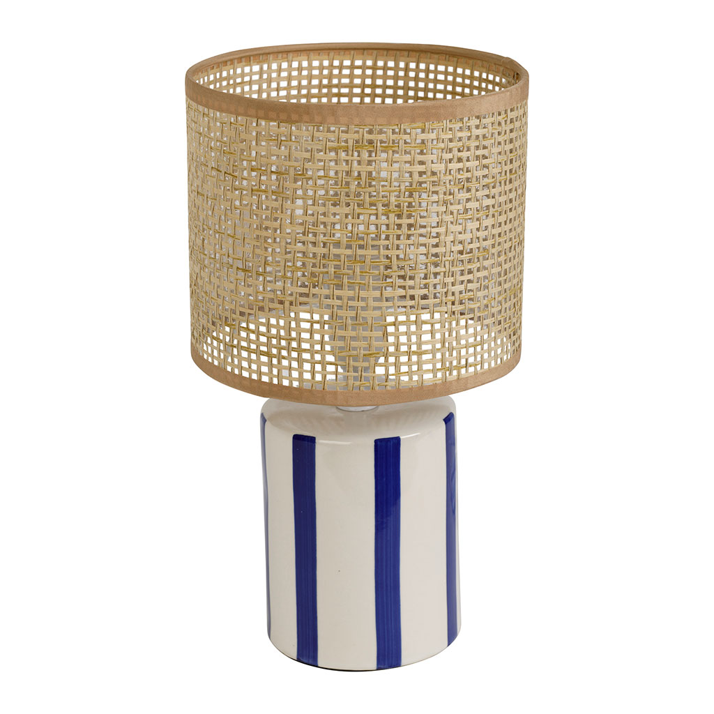 05 56 69 68 67-contact@fabriquedestyles.frLampe en rotin et céramique rayée indigo et blanc h27cm E14 - Medi