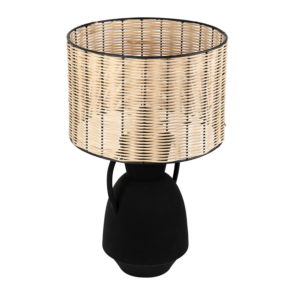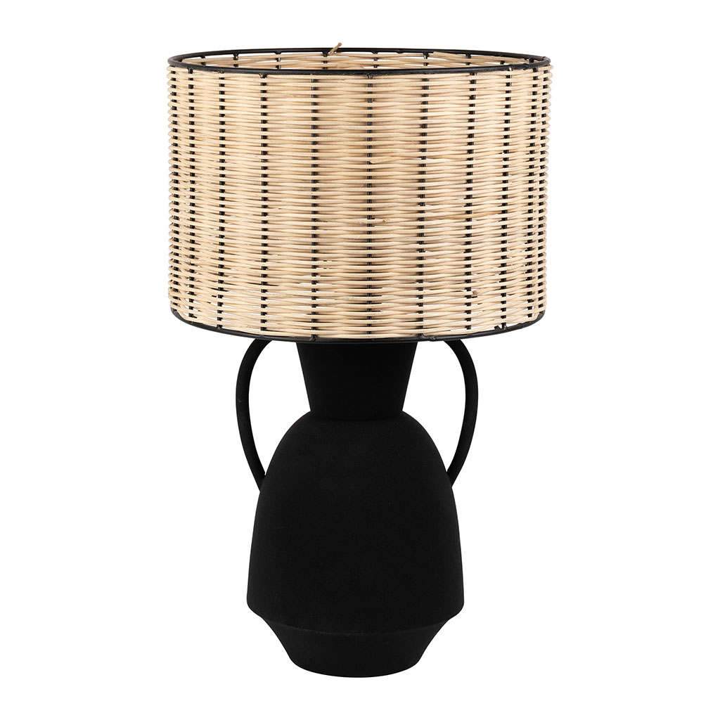 Son abat-jour en rotin crée une ambiance chaleureuse et naturelle, tandis que le pied de lampe noir, agrémenté d'anses, apporte une touche moderne.