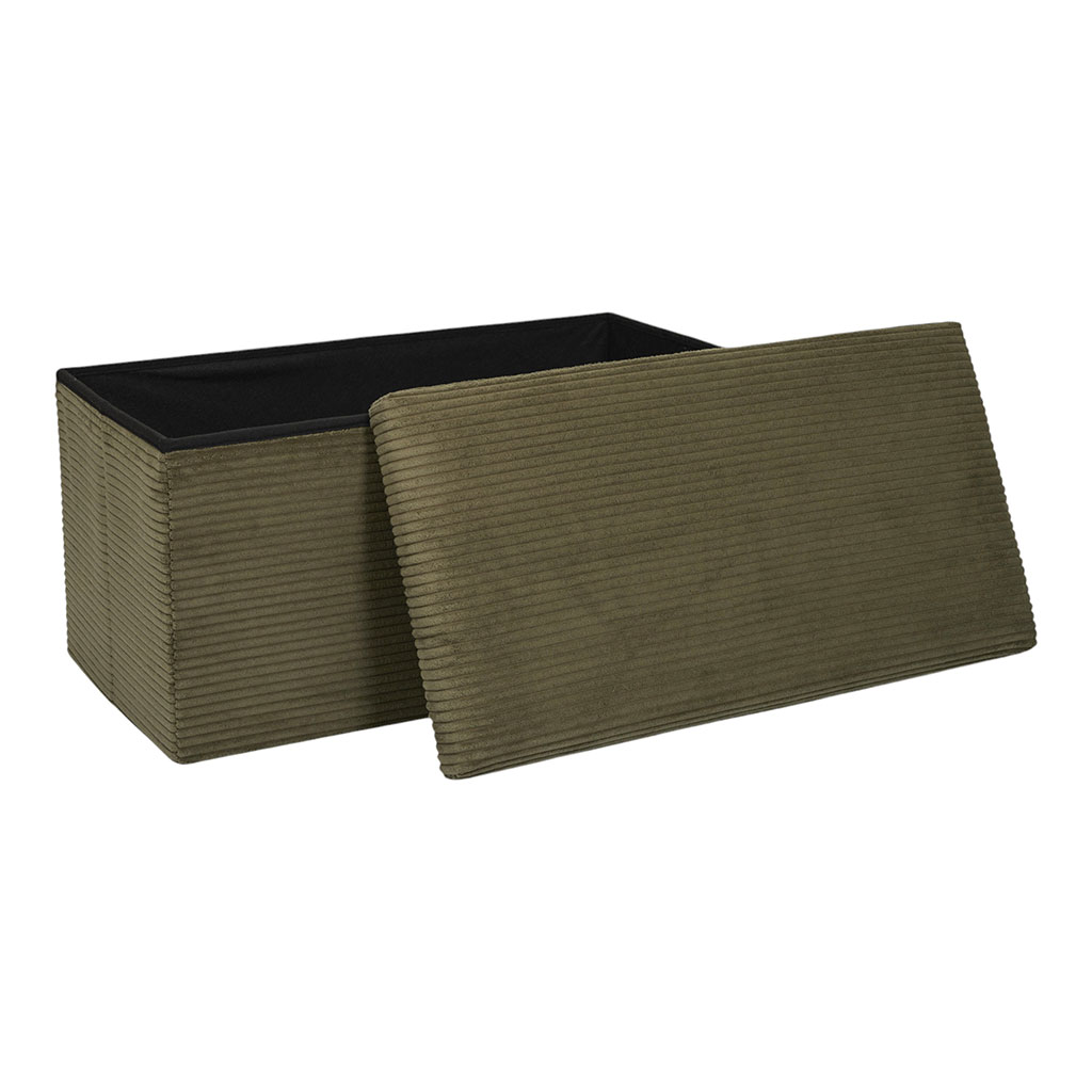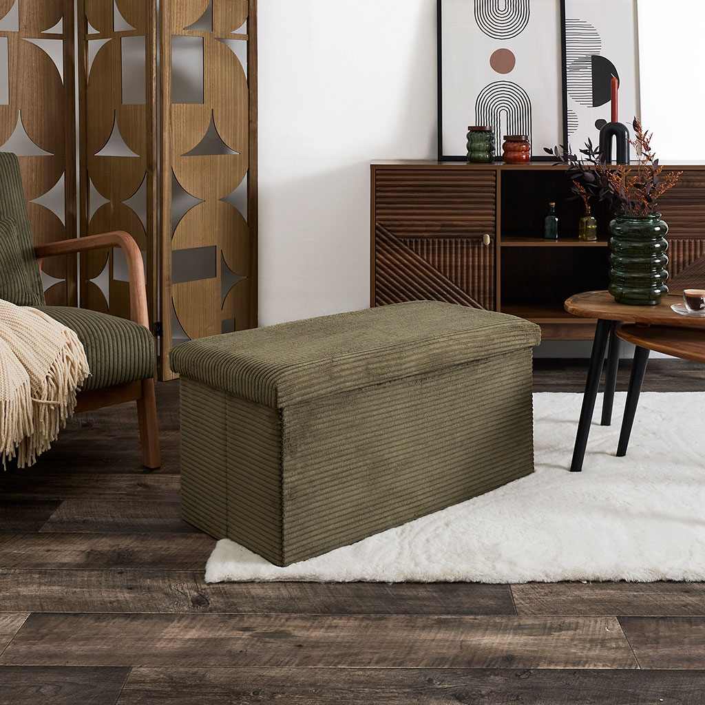 Transformez votre espace de vie avec cet ingénieux banc coffre pliable en tissu côtelé vert.