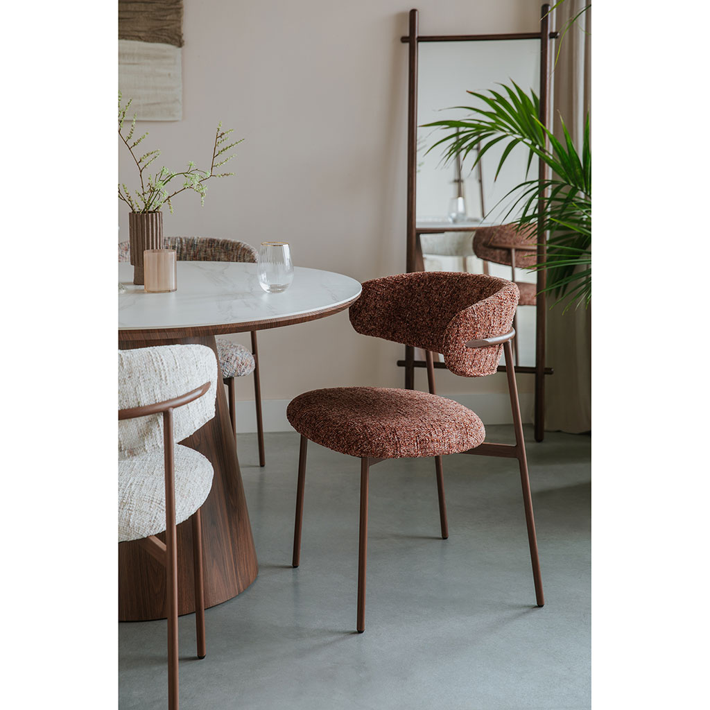 Dotée d'un design moderne et chaleureux, cette chaise attire l'œil par sa teinte terracotta unique, apportant une touche de couleur subtile à votre intérieur.