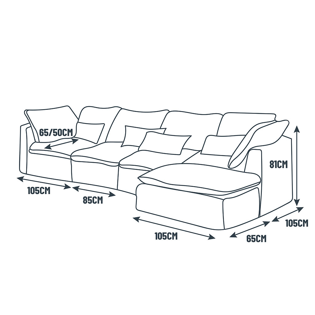 Dimension canapé avec le pouf en méridienne : Longueur 295cm - Profondeur 170cm - Hauteur 81cm.