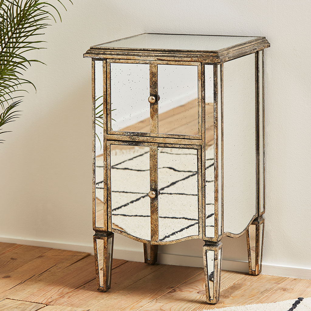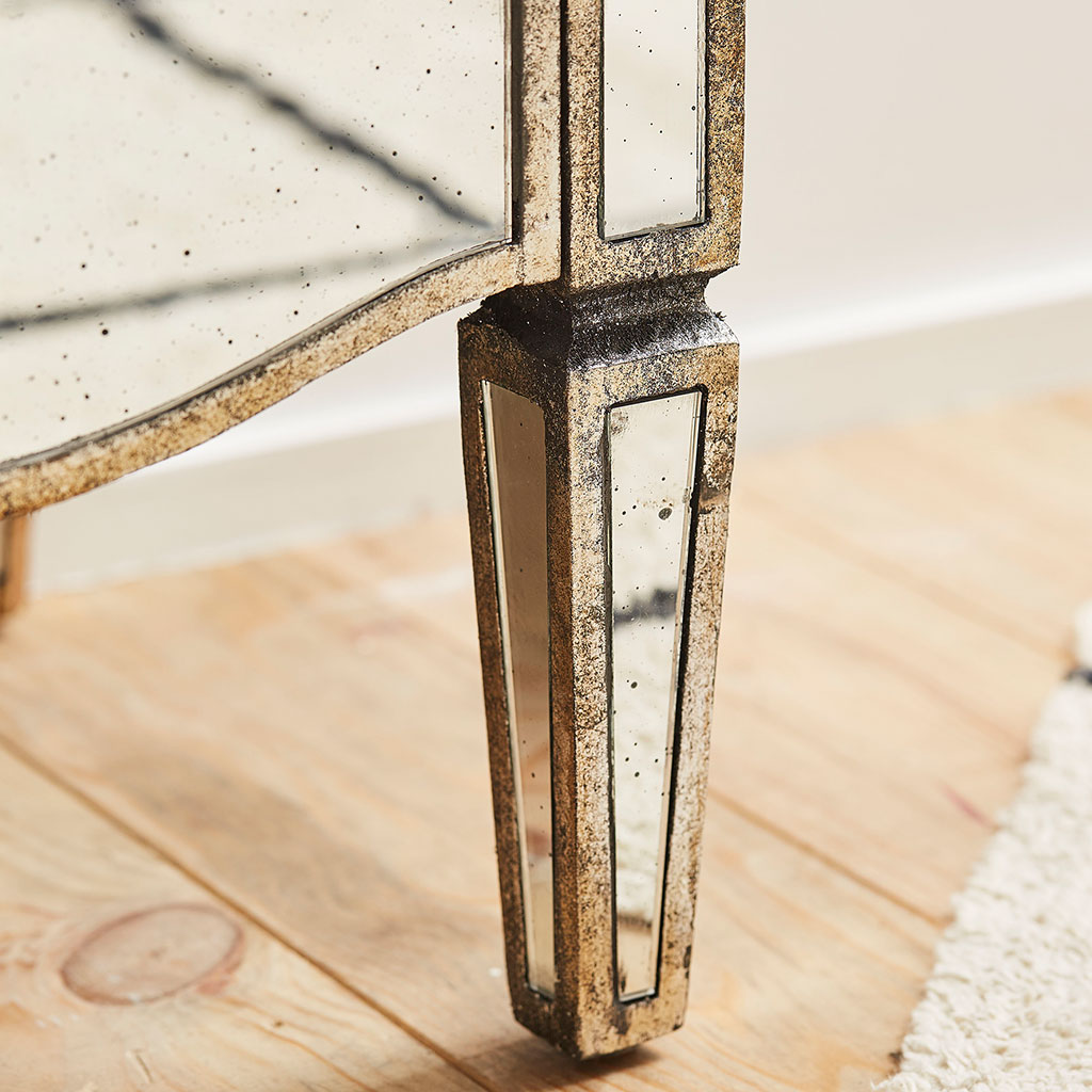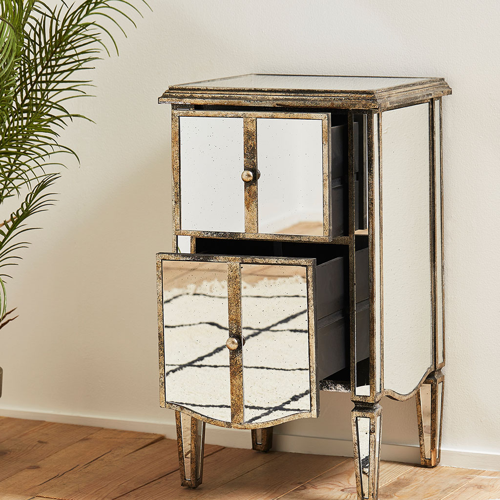 Ce chevet marie le bois patiné et le verre pour offrir un meuble au style résolument vénitien. Ce mélange de matières appelé le bois miroir trouvera parfaitement sa place dans une maison ou un appartement à la déco classique chic. Si sa forme reste