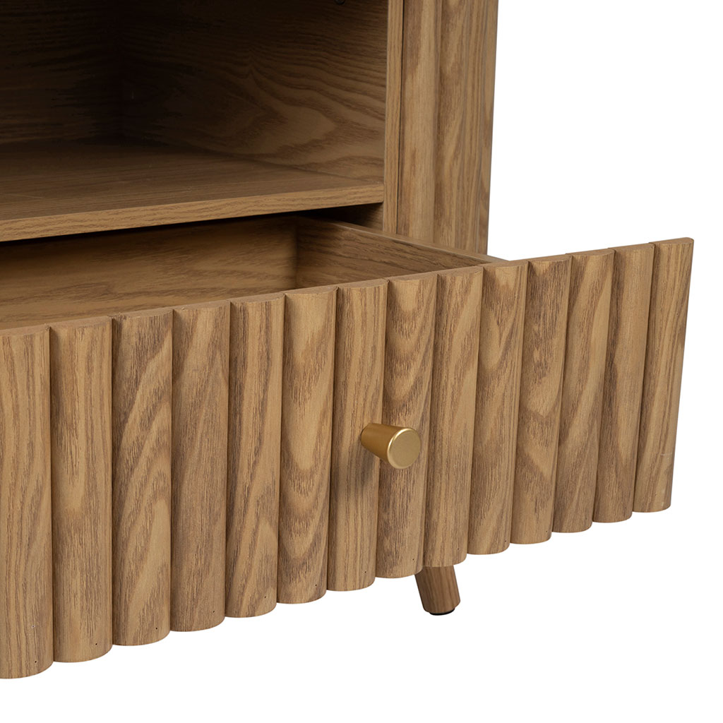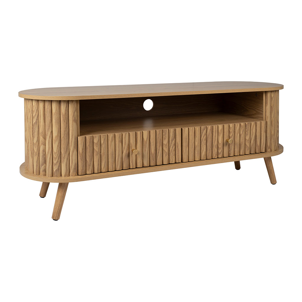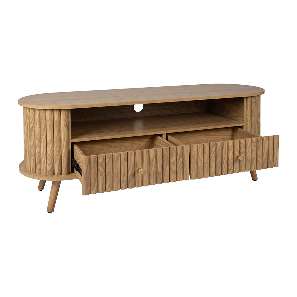 Le meuble de télévision Saori dispose d'une étagère et de deux tiroirs pour ranger discrètement vos objets les plus personnels.