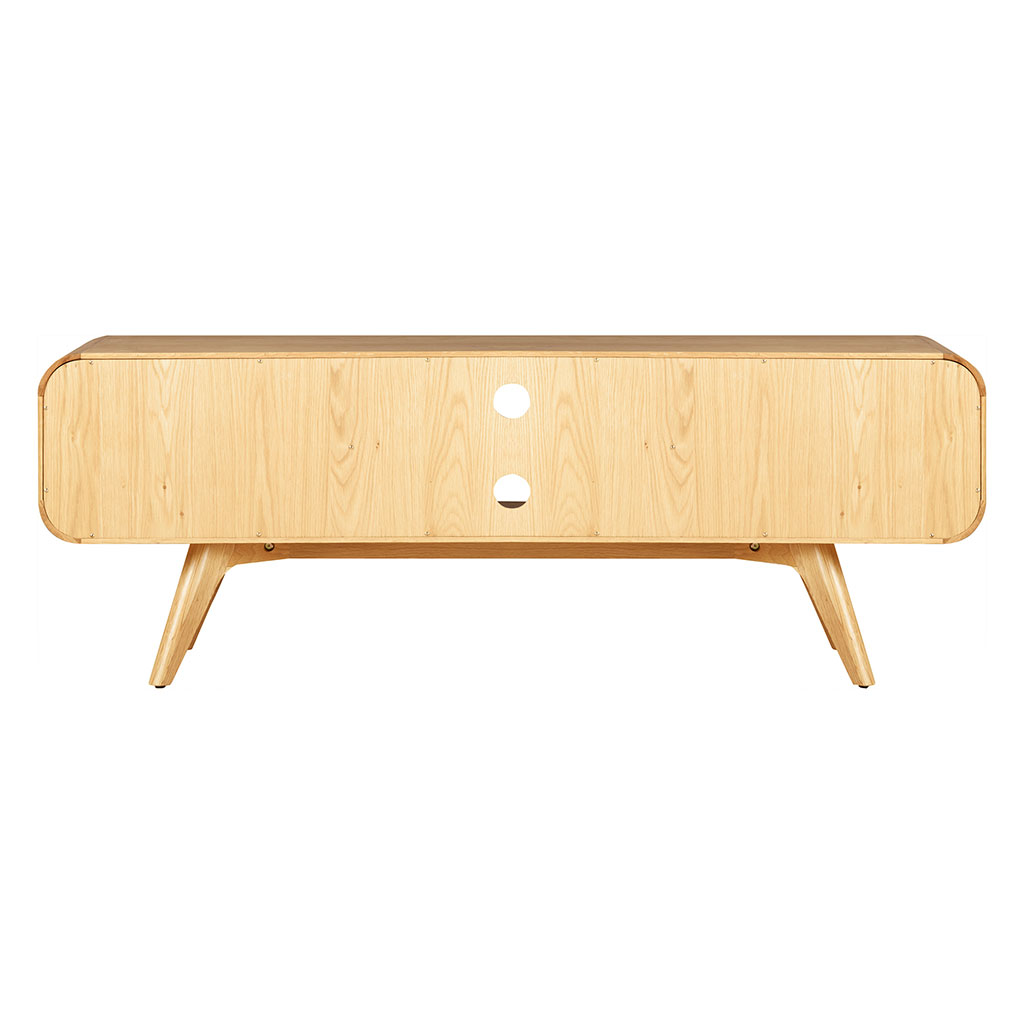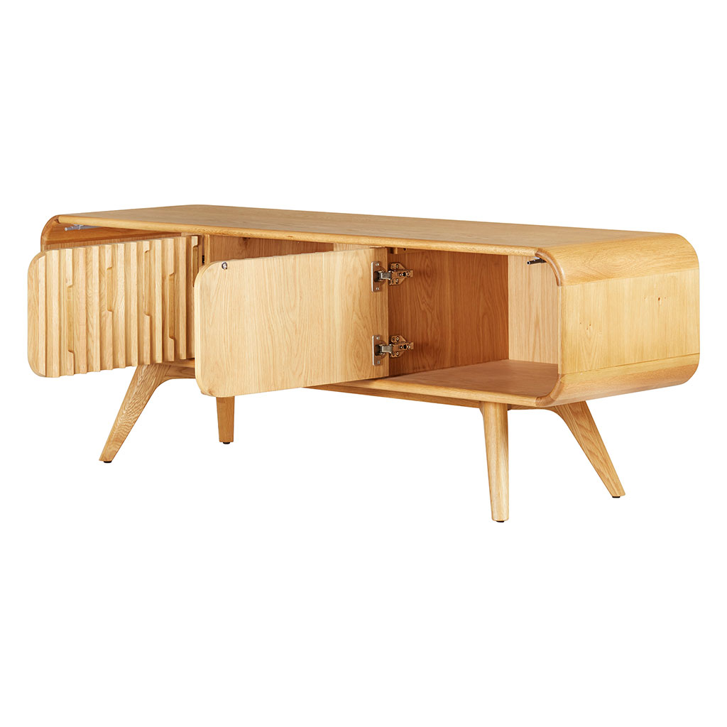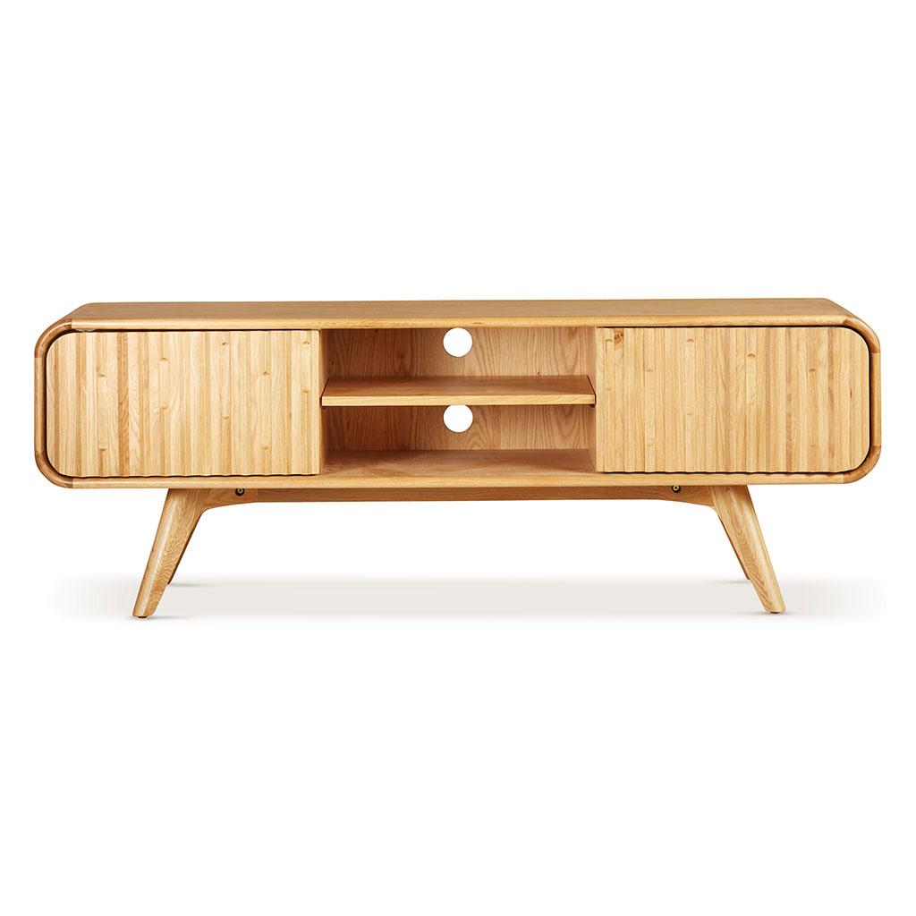 Ce meuble TV en chêne naturel de 165 cm combine à merveille le style rétro et moderne pour rehausser votre espace.