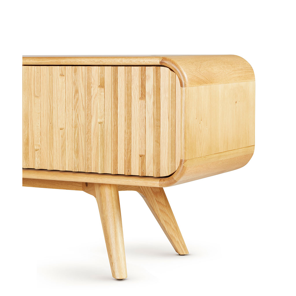 Ses lignes arrondies et ses pieds inclinés rappellent un design vintage, tandis que le bois de chêne naturel apporte une touche moderne et chaleureuse.