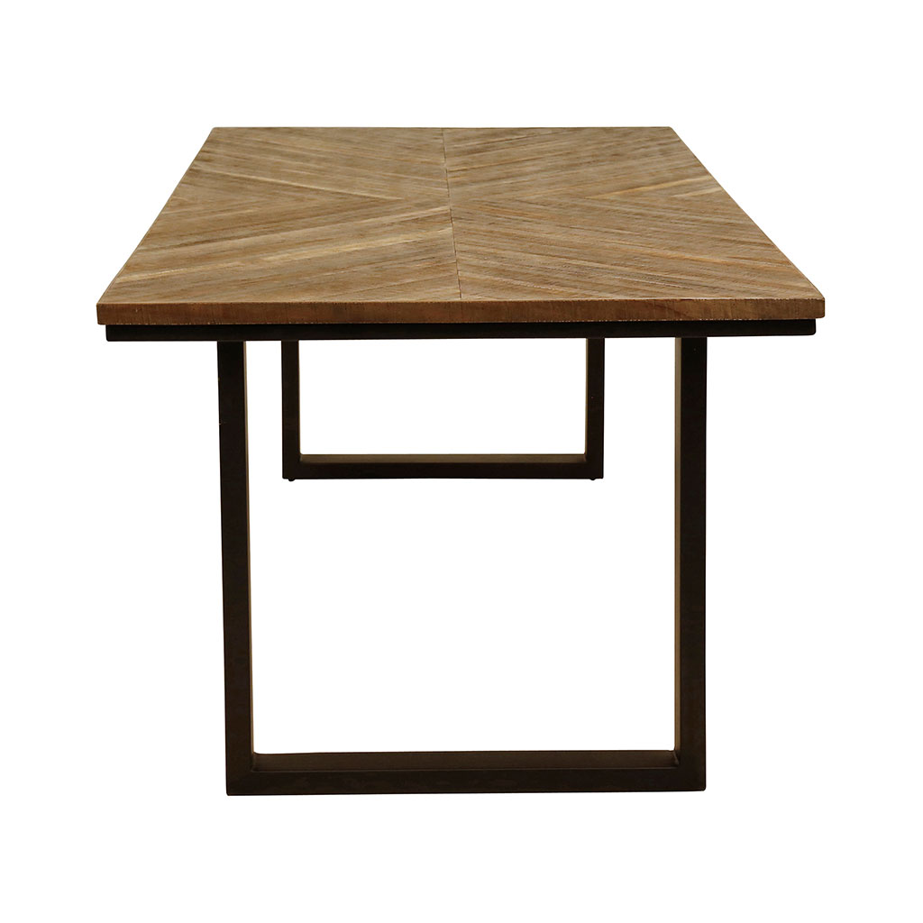 Avec son plateau en teck recyclé et ses pieds en métal noir, cette table repas arbore un look original.