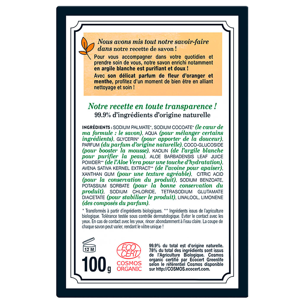 05 56 69 68 67-contact@fabriquedestyles.frSavon solide fleur d'oranger et menthe - Cosmébio