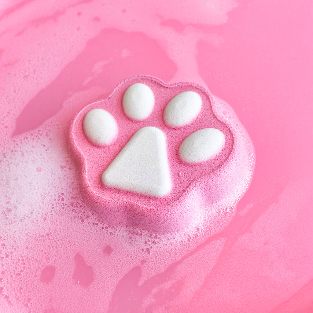 Bombe de bain patte de chat rose/blanc, parfum fraise : Sodium Bicarbonate, Citric Acid, Maltodextrin, Sodium sulfate, Sorbitol, PEG-400, Parfum, Benzyl Alcohol, Benzyl benzoate, Hexamethylindanopyran, CI 17200, CI 42090, CI 14700.