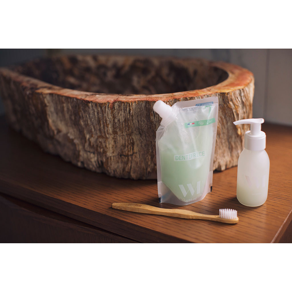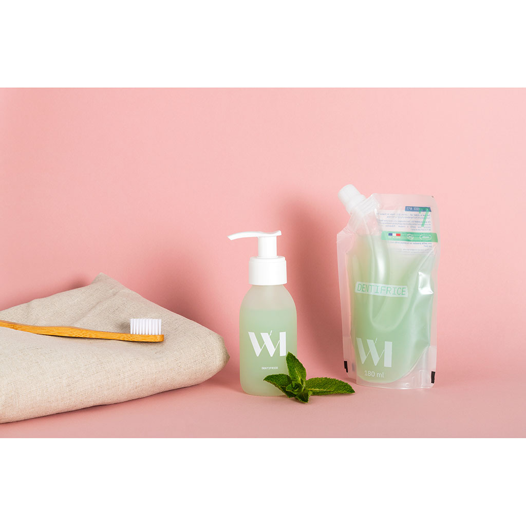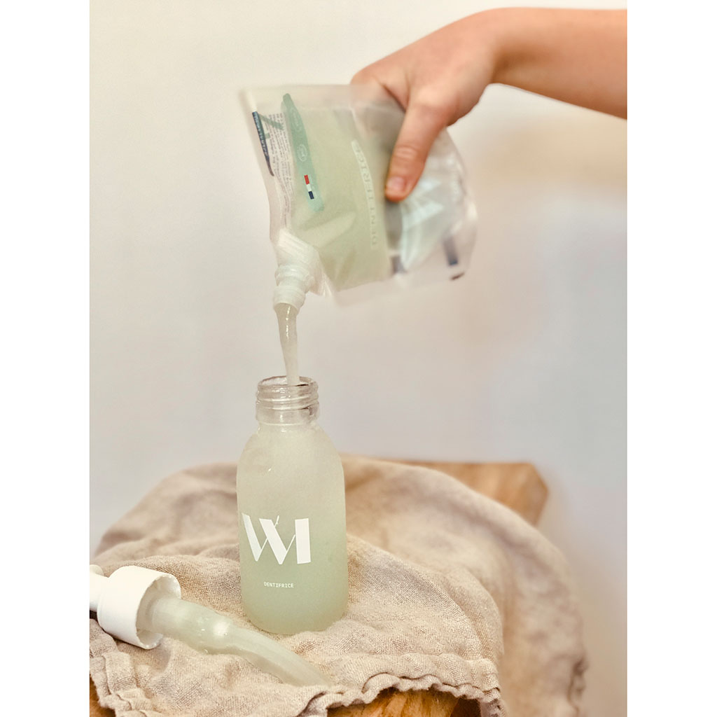 Développée avec des dentistes, sa formule suit les recommandations de l'union française pour la santé Bucco-dentaire et son flacon en verre renforcé® est 100% rechargeable.