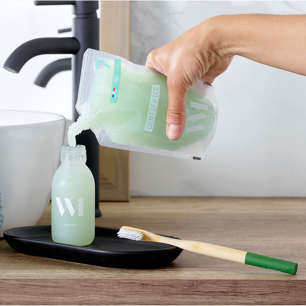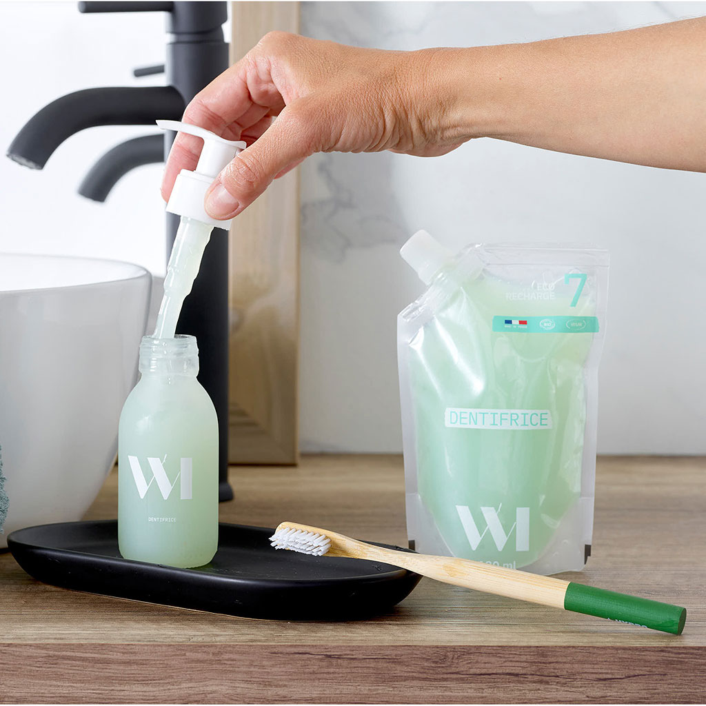 Développée avec des dentistes, sa formule suit les recommandations de l'union française pour la santé Bucco-dentaire et son flacon en verre renforcé® est 100% rechargeable.