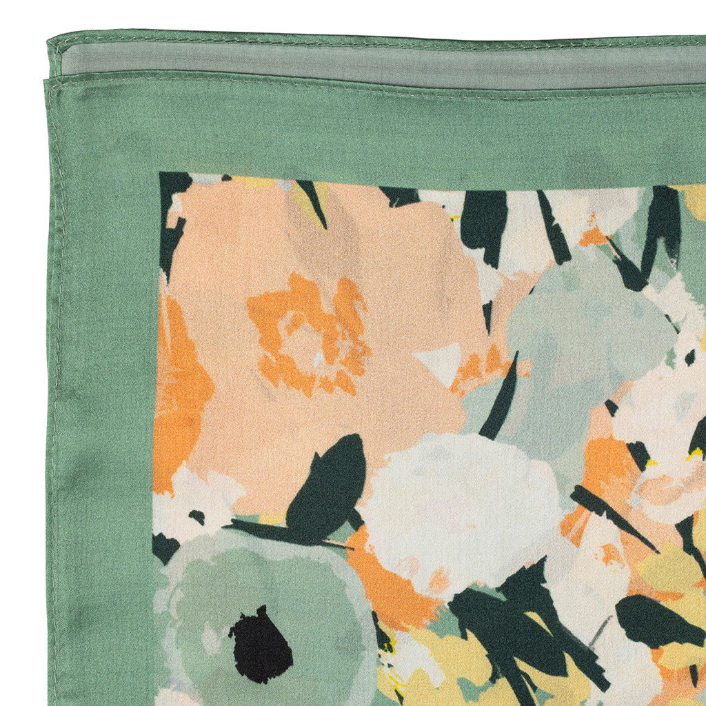Ce foulard en soie naturelle se distingue par sa délicatesse et ses tons doux, qui évoquent la beauté florale d'un jardin en fleur.