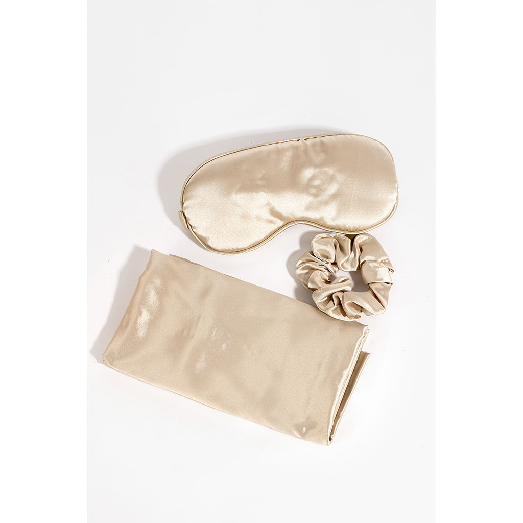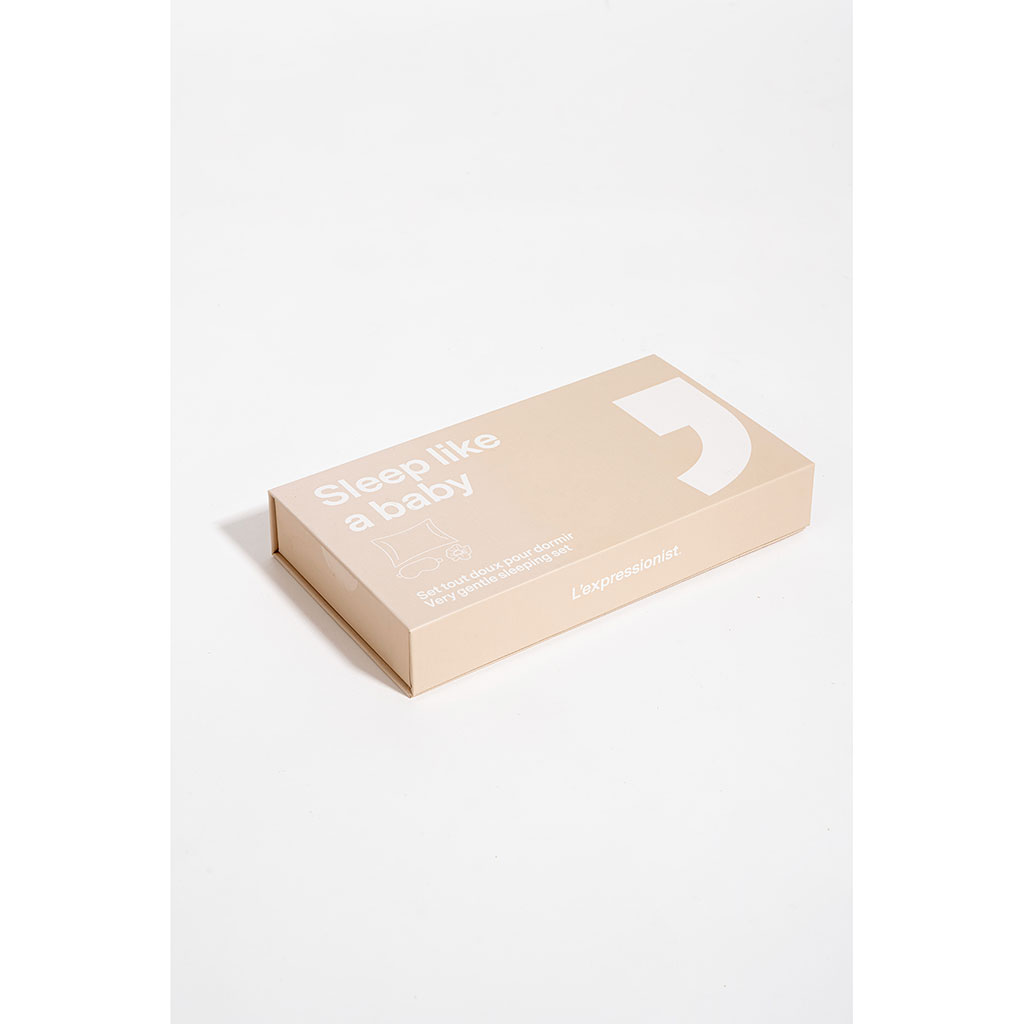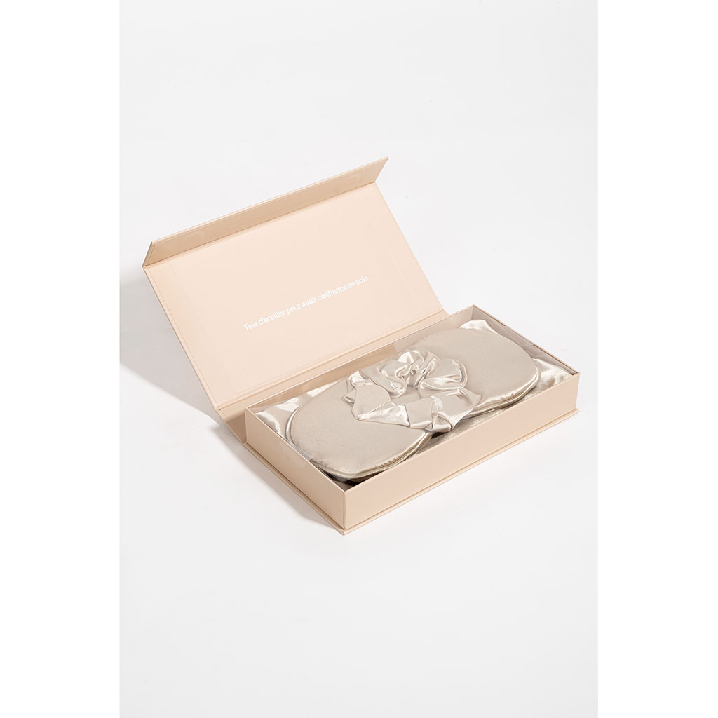 Ce kit comprend tout ce dont vous avez besoin pour créer un cocon de tranquillité dans votre chambre : 1 taie d'oreiller soyeuse, 1 masque ultra-doux et 1 chouchou éléguant
