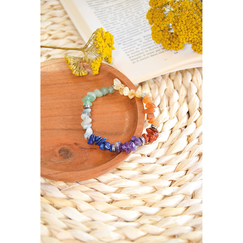 Bracelet élastique en pierres naturelles composé de perles chips aux couleurs des 7 chakras principaux : jaspe rouge, calcite orange, citrine (améthyste chauffée), aventurine verte, aigue-marine, lapis-lazuli et améthyste.
