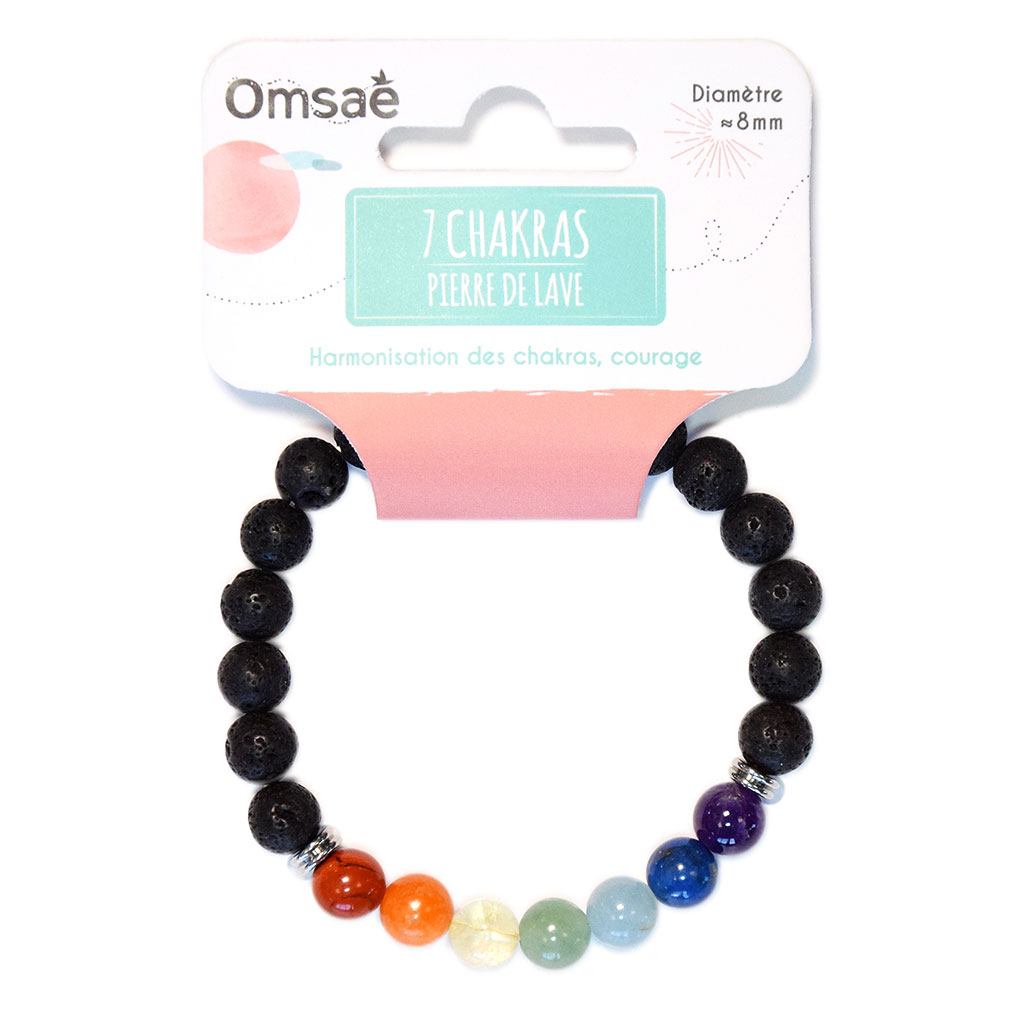Bracelet élastique en pierres naturelles composé de perles rondes en pierre de lave et de 7 perles aux couleurs des 7 chakras principaux : jaspe rouge, calcite orange, citrine (améthyste chauffée), aventurine verte, aigue-marine, lapis-lazuli et