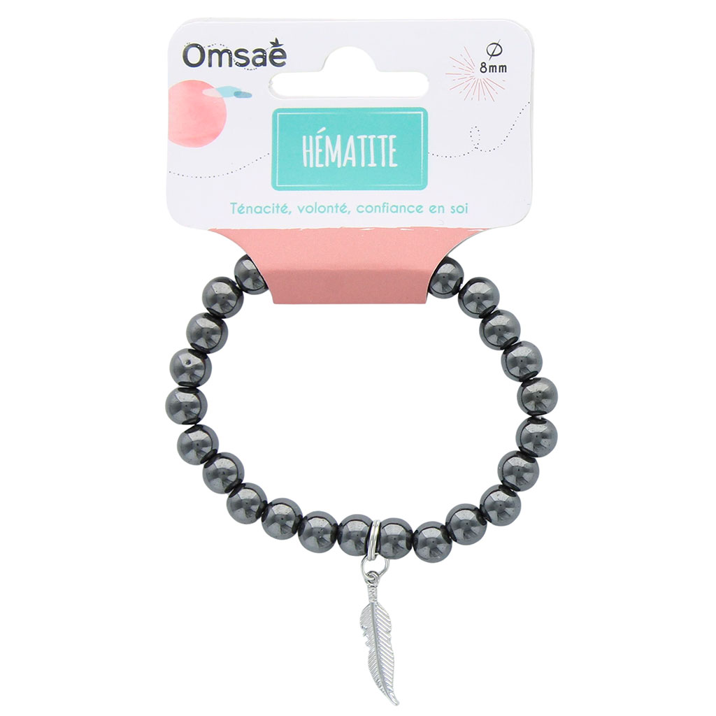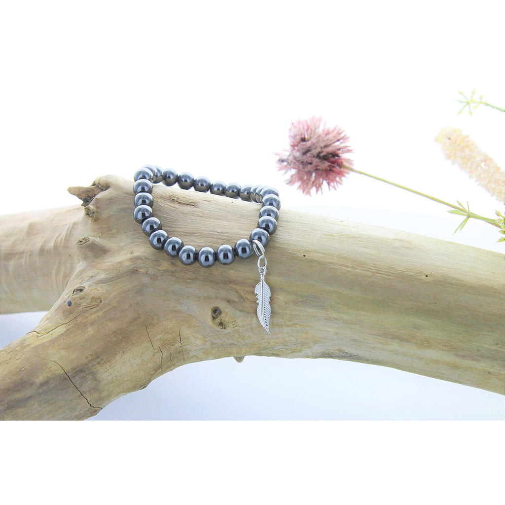 Bracelet élastique composé de perles en pierre naturelle d'hématite et d'une breloque plume argentée. L'hématite renforce la confiance en soi, la concentration et donne la volonté de s’engager pleinement dans ses projets.