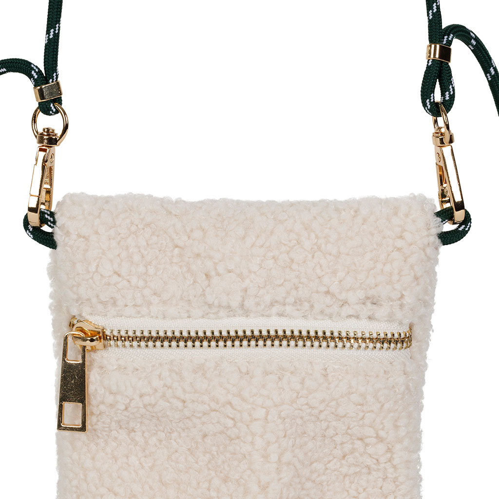 05 56 69 68 67-contact@fabriquedestyles.frPochette en tissu bouclette écru avec lanière émeraude - Funky