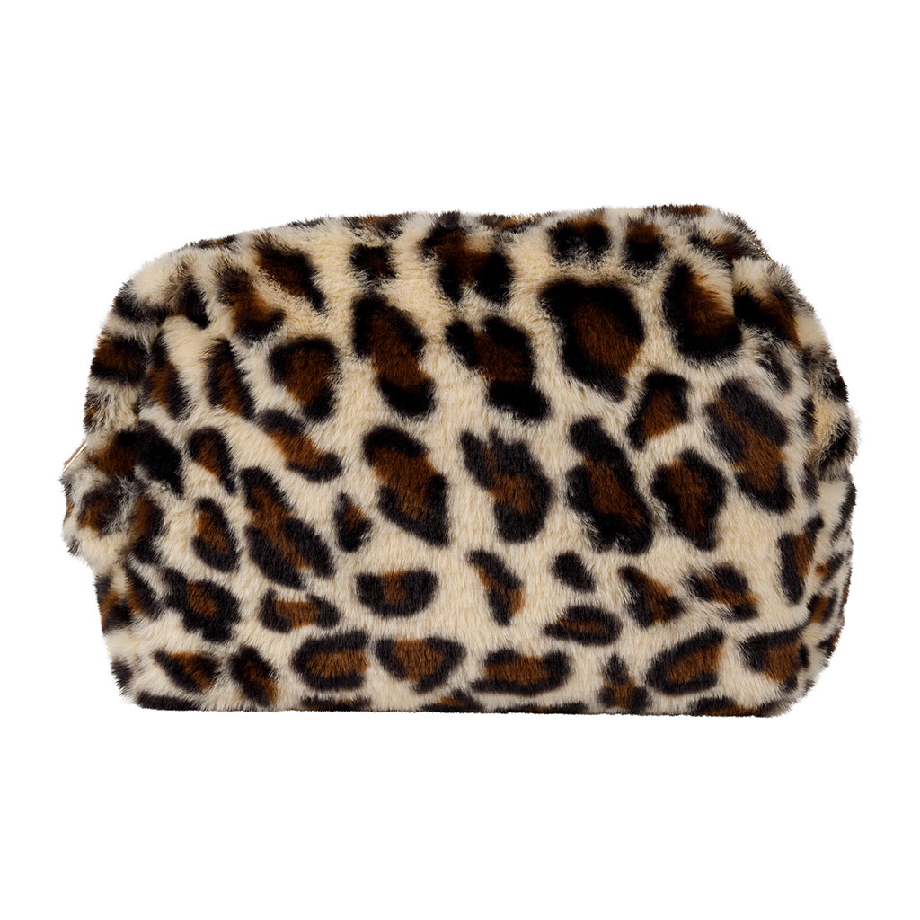 Découvrez l'incarnation du style sauvage avec notre trousse de toilette en fausse fourrure léopard écru et brun.
