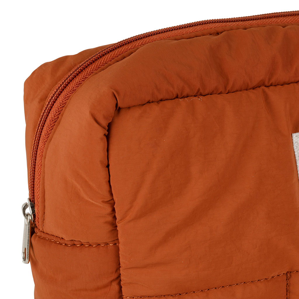 Découvrez notre trousse de toilette en tissu matelassé terracotta, un compagnon de voyage indispensable qui allie praticité et style sans effort.