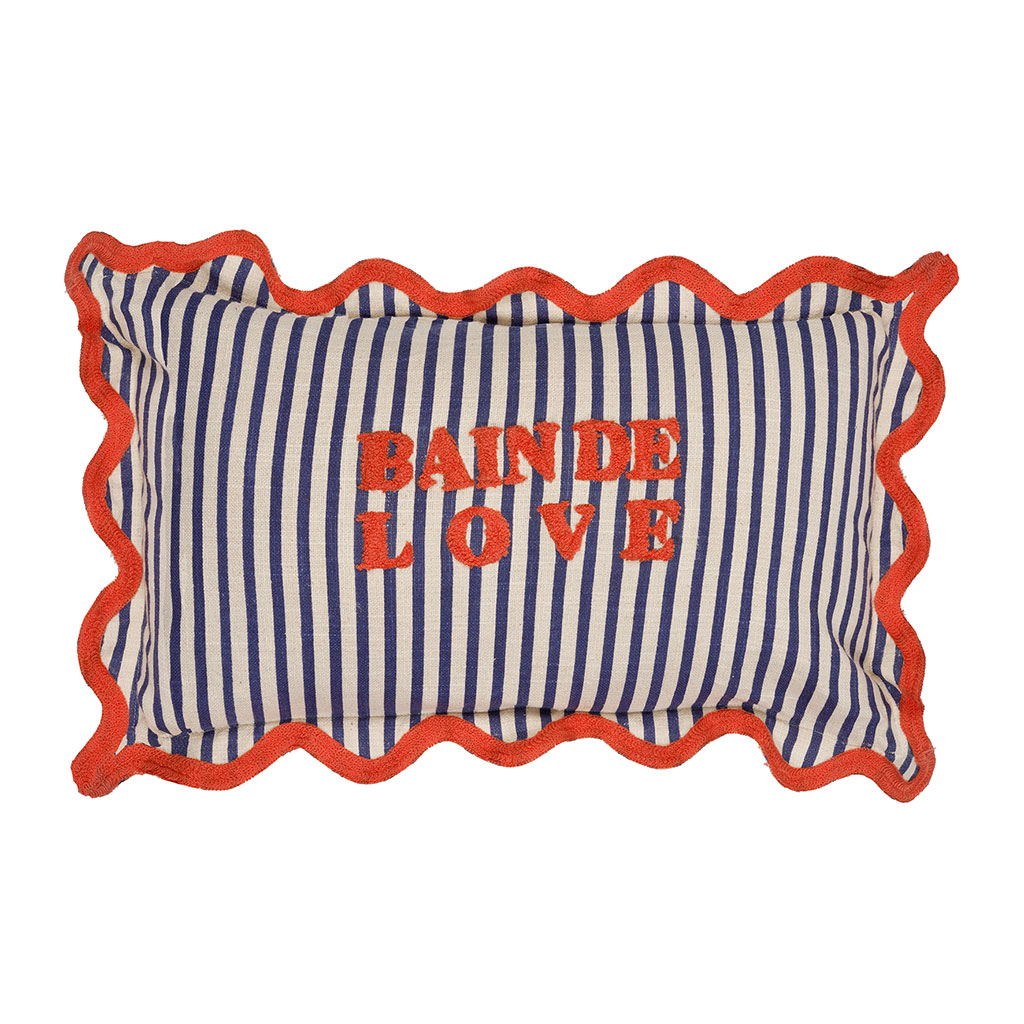 05 56 69 68 67-contact@fabriquedestyles.frCoussin en coton brodé "bain de love" rayé bleu et rouge 50x30cm - Plouf&Sun