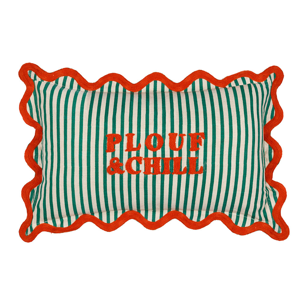 05 56 69 68 67-contact@fabriquedestyles.frCoussin en coton brodé "plouf&chil" rayé vert et rouge 50x30cm - Plouf&Sun