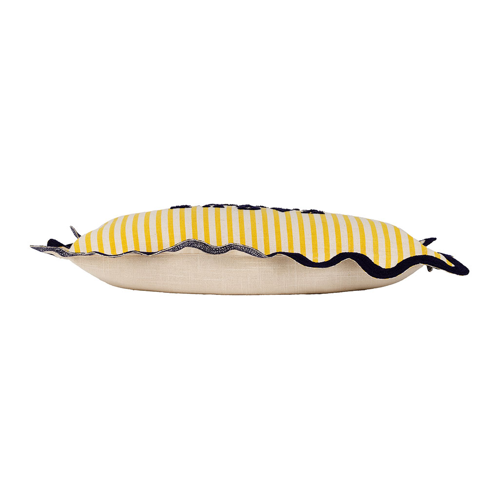 05 56 69 68 67-contact@fabriquedestyles.frCoussin en coton brodé "vague d'amour" rayé jaune et bleu marine 50x30cm - Plouf&Sun