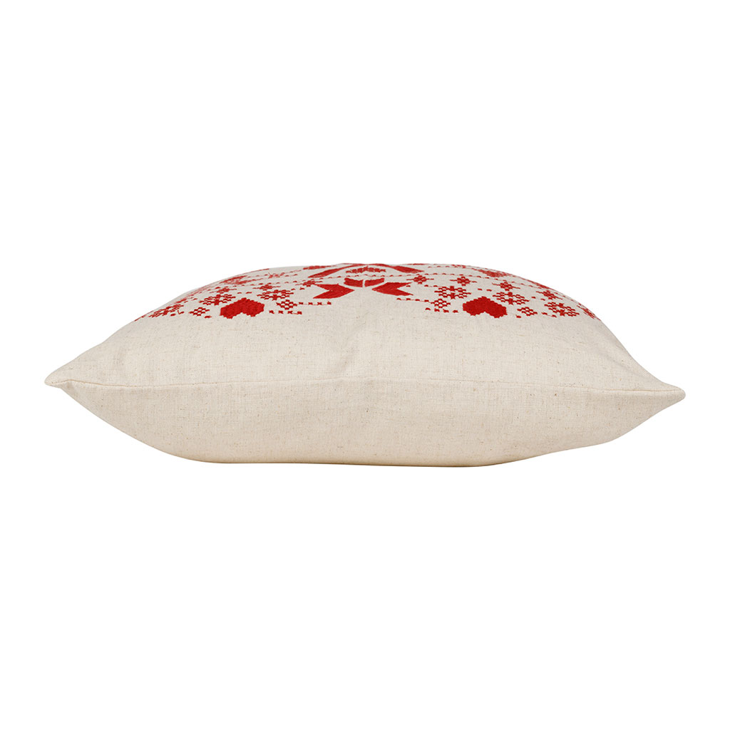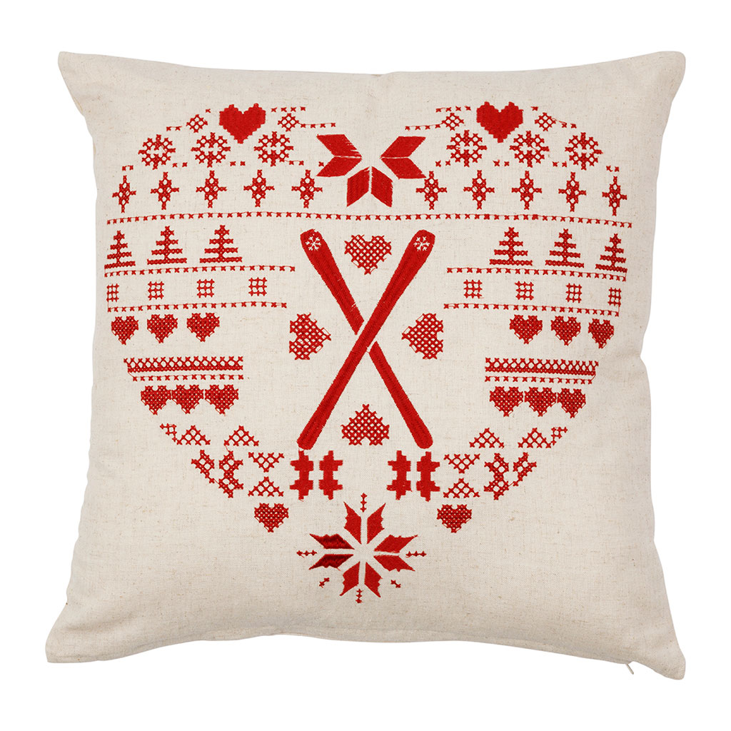 Sur un fond beige naturel, des broderies rouges représentent un cœur orné de sapins, flocons, petits cœurs et skis croisés, pour une déco typique de style chalet ou esprit scandinave.