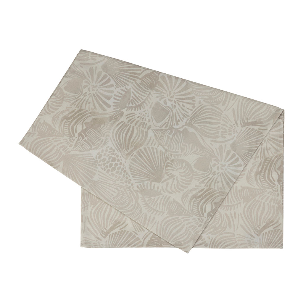 Le chemin de table en coton sable de dimensions 160x50cm, orné de motifs de coquillages, est l'accessoire parfait pour donner une touche moderne à votre table.