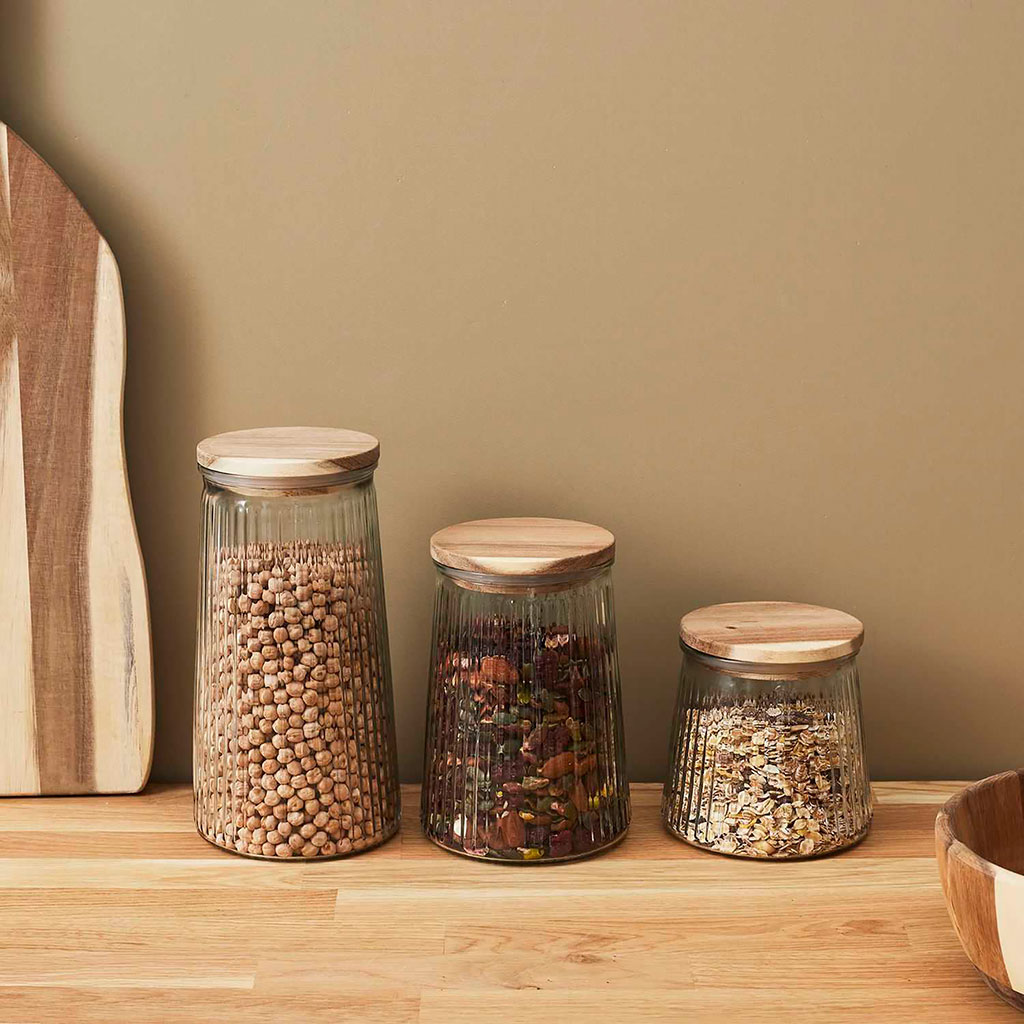 Ce bocal en verre Top Acacia de 95 cl est à la fois pratique et stylé pour organiser votre cuisine avec goût.