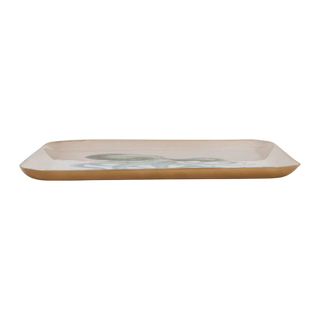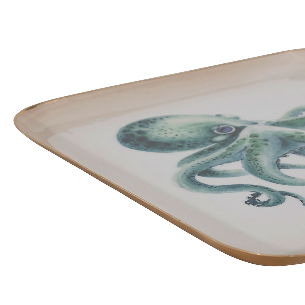 Ce plateau carré en fer turquoise séduit par son illustration marine représentant un poulpe.