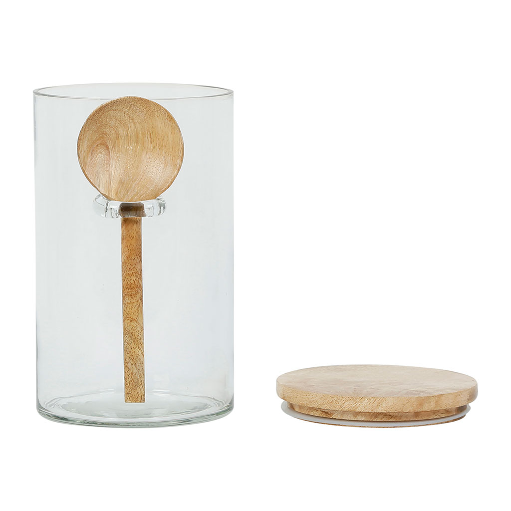 Découvrez l'accessoire incontournable pour votre cuisine : ce bocal en verre muni d'une cuillère et d'un couvercle pratique.
