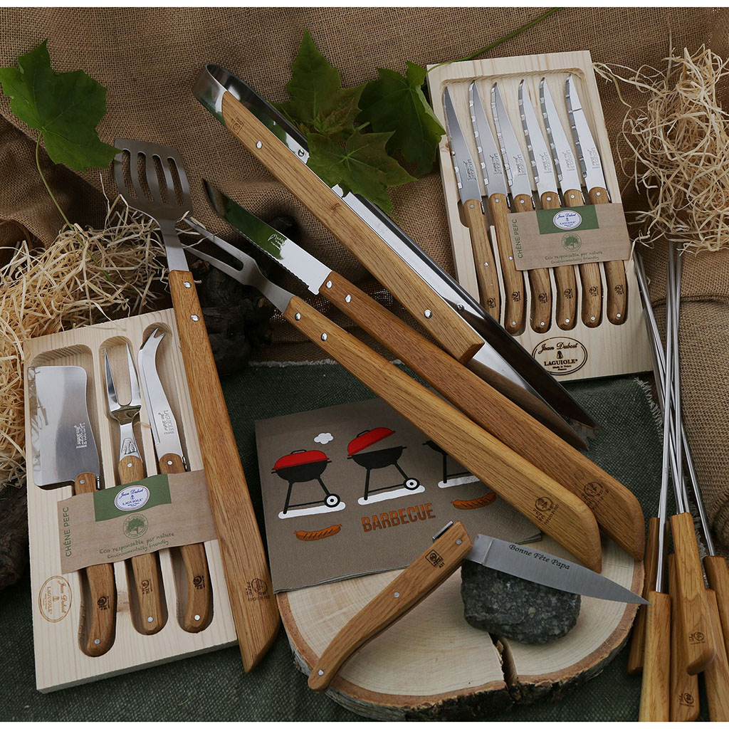 Rehaussez votre expérience culinaire avec le Coffret de 6 Couteaux à Steak Laguiole, caractérisé par des manches en chêne pour une élégance naturelle.