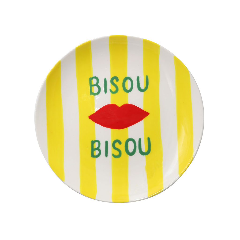 05 56 69 68 67-contact@fabriquedestyles.frAssiette à dessert "Bisou bisou" en céramique rayée jaune et blanc d19cm