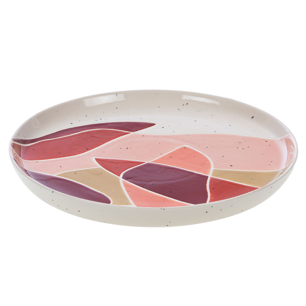 Cette assiette plate en grès de grande taille se définit par son décor artistique aux teintes terracotta, ocre et rose poudré.