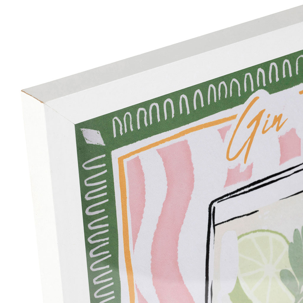 Découvrez un ajout vibrant et ludique à votre intérieur avec ce cadre déco qui met en scène un motif original de gin tonic en rose et vert.