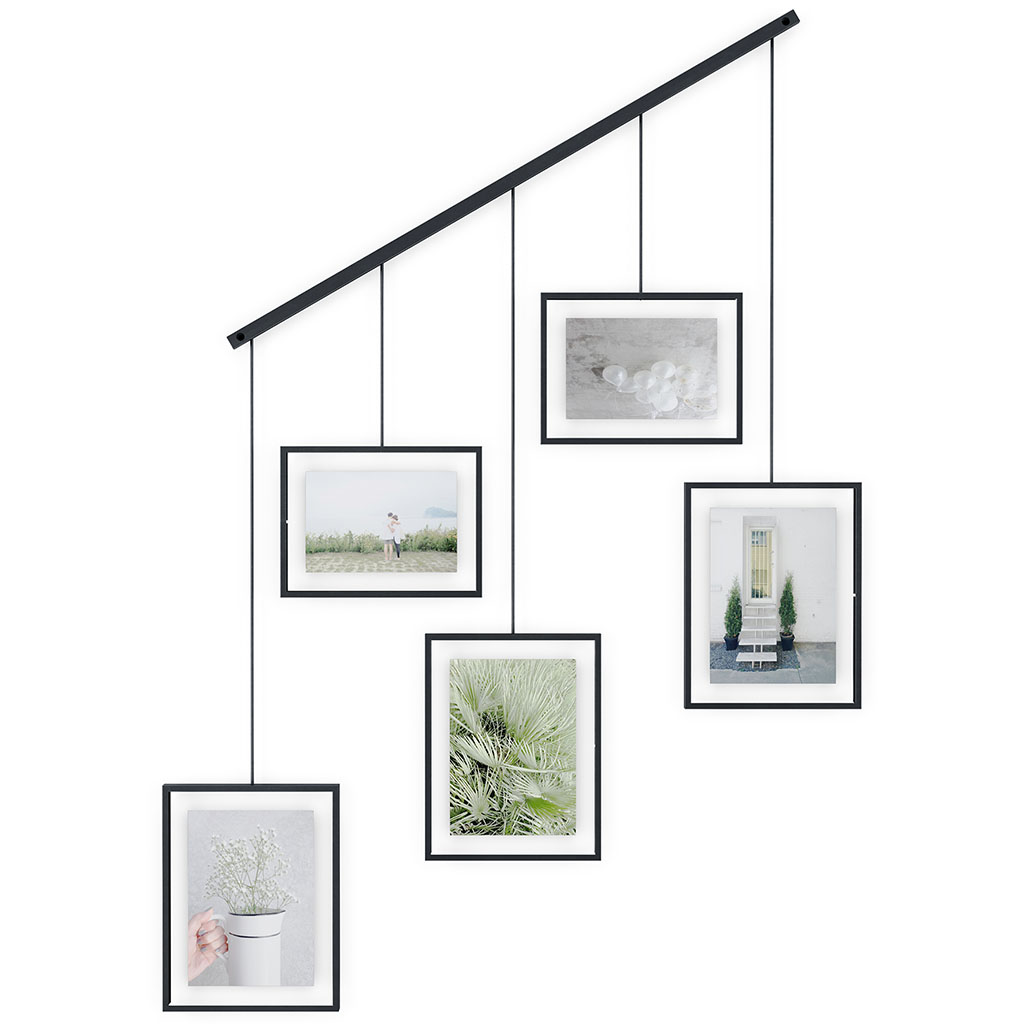 PRESENTATION ADAPTABLE : Chaque photo peut être interchangée en déplacant la tige sur la barre horizontale. La barre verticale peut elle même être suspendue inclinée de facon à suivre la pente d'un escalier ou d'une sous pente de toit.