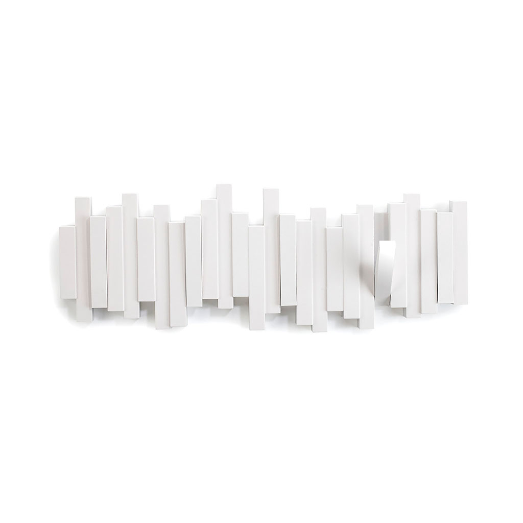 La patère murale blanche avec 5 crochets rabattables, idéale pour organiser vos affaires avec style.