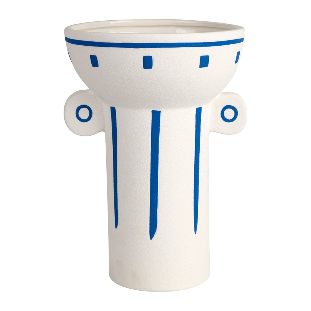 Ce vase en porcelaine aux nuances bleues et blanches se distingue par son design inspiré des traditions grecques.