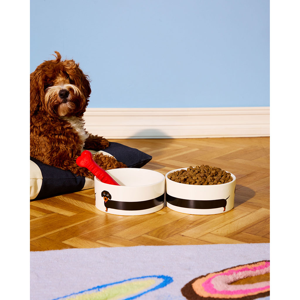 Cette gamelle en céramique arbore une silhouette de teckel étirée, offrant un design ludique et horizontal pour votre animal de compagnie.