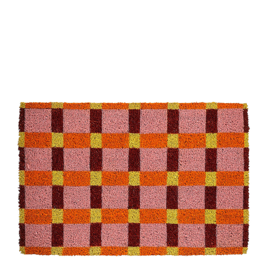 Ce paillasson en fibre de coco se pare d'un motif à carreaux pêche et crème pour offrir un accueil chaleureux dès le pas de la porte.