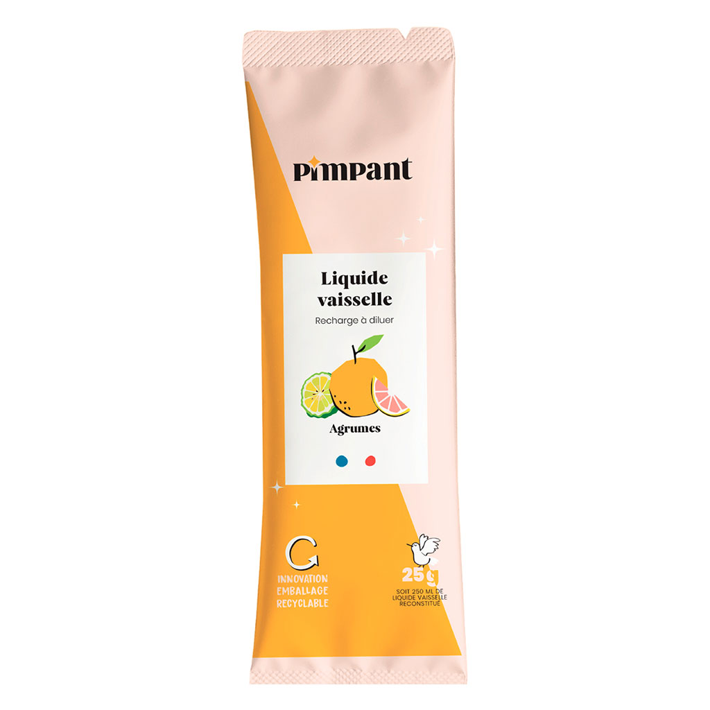 Le liquide vaisselle en poudre Pimpant aux agrumes constitue une alternative durable et sensorielle pour le nettoyage efficace de votre vaisselle au quotidien.