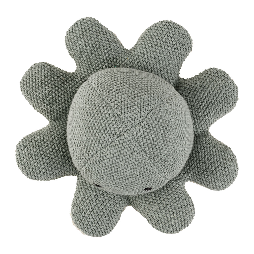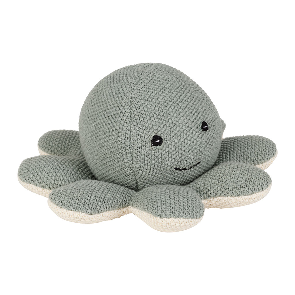 Découvrez la peluche en forme de poulpe fabriquée en coton sauge, un compagnon idéal pour l'heure du jeu ou du dodo.