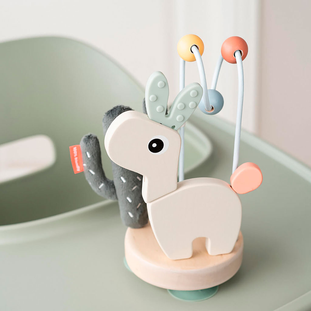 Éléments stimulants comme un petit labyrinthe à perles, des sons attirants et des éléments flexibles.