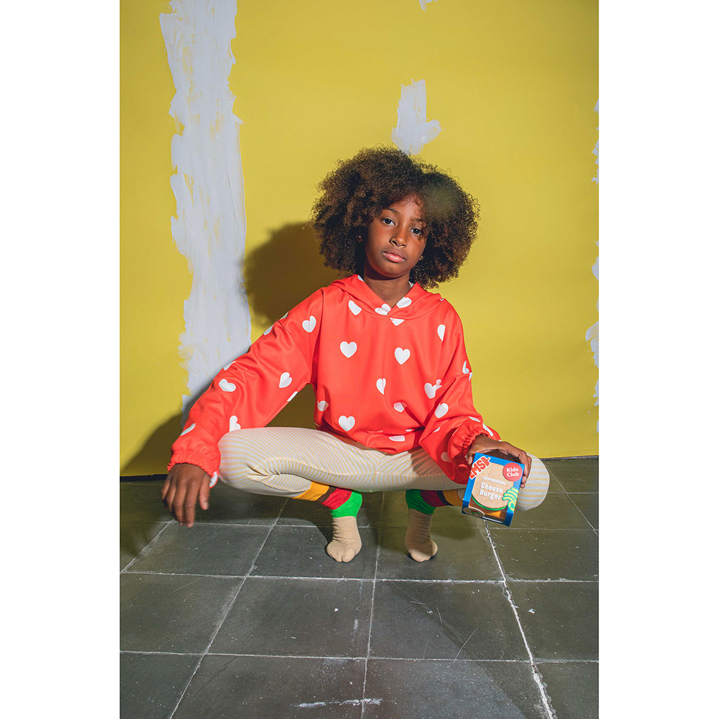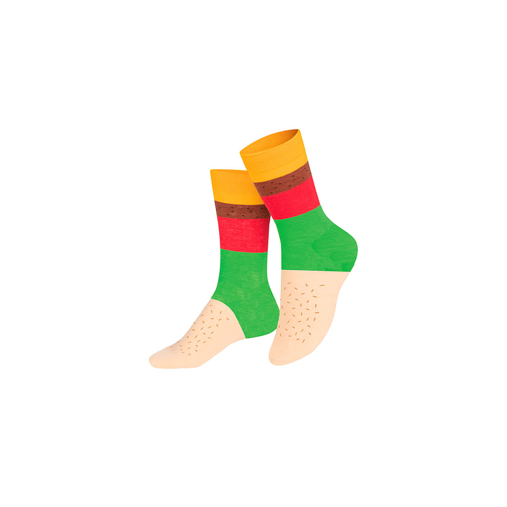 Avec leurs bandes colorées qui reprennent les couches d’un cheeseburger – pain, salade, tomate, fromage et steak – ces chaussettes pour enfant ne passent pas inaperçues.