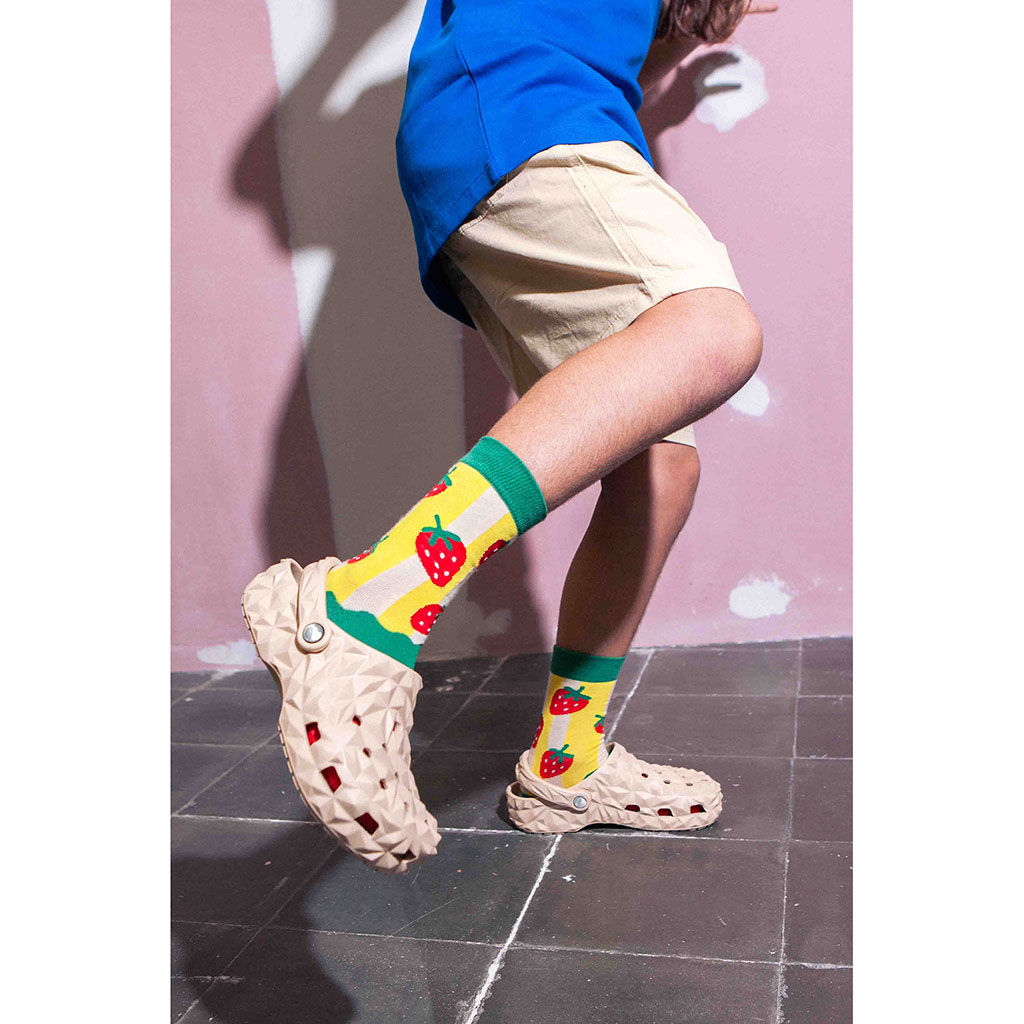 Ces chaussettes colorées aux motifs de fraises et feuillages sont parfaites pour ajouter une touche fruitée et joyeuse à la garde-robe des enfants.