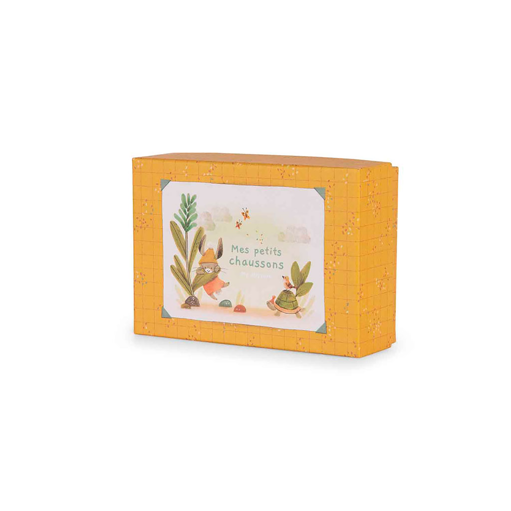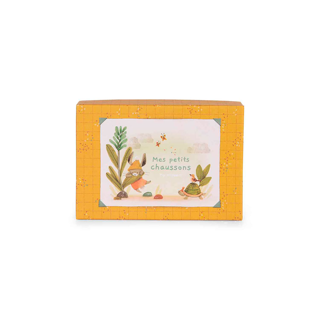 Parfaits pour garder bébé bien au chaud dès la naissance, ces chaussons sont présentés dans une jolie boîte illustrée, idéale pour un cadeau de naissance.