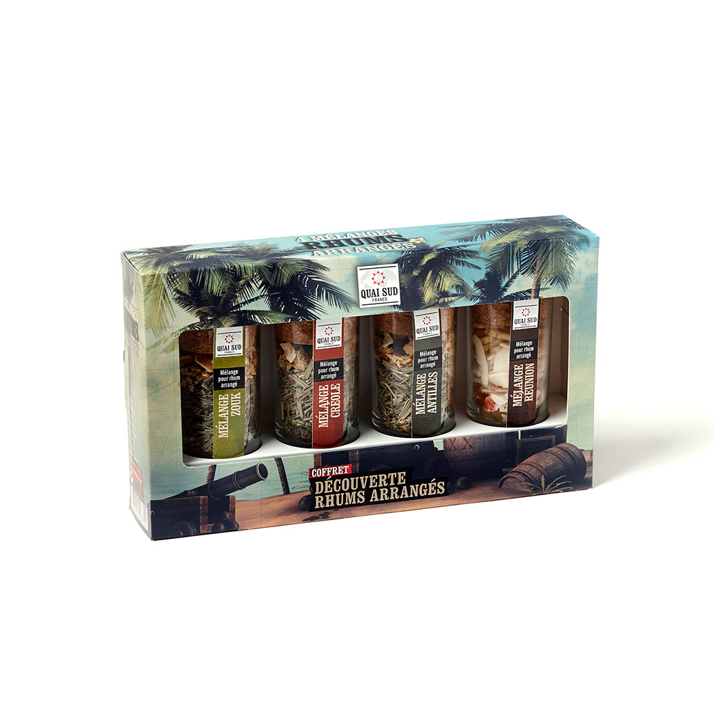 Ce coffret propose une sélection de rhums infusés aux arômes naturels, chaque bouteille racontant une histoire distincte à travers ses notes parfumées.