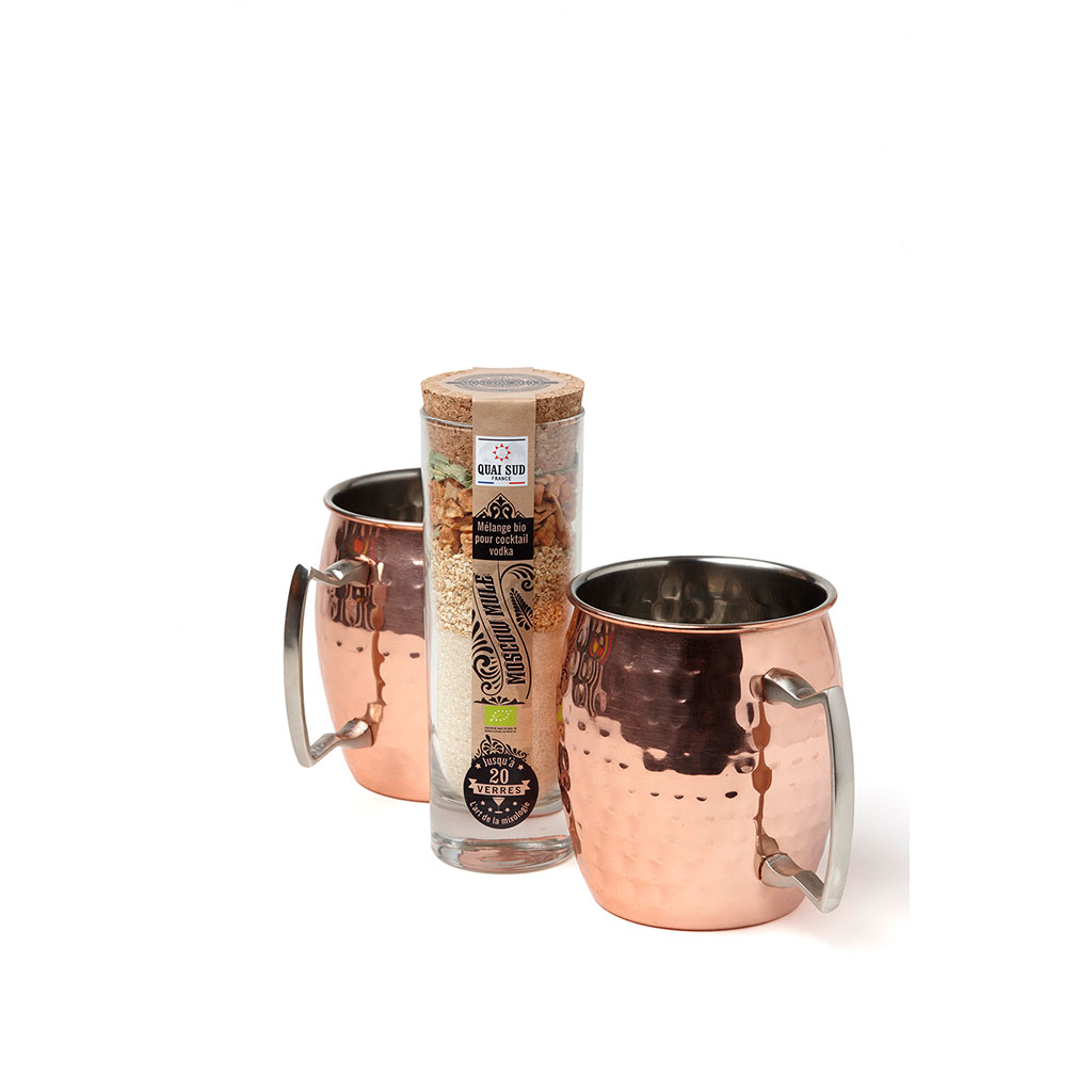 05 56 69 68 67-contact@fabriquedestyles.frCoffret préparation cocktail Moscow Mule bio avec 2 tasses en cuivre 110?g
