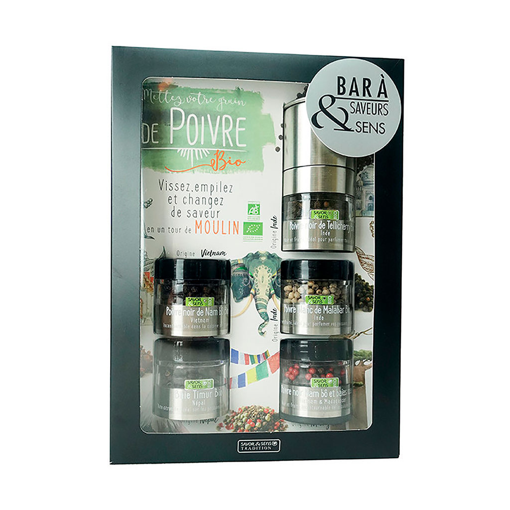 05 56 69 68 67-contact@fabriquedestyles.frBar à poivres bio avec moulin intégré - 5 poivres