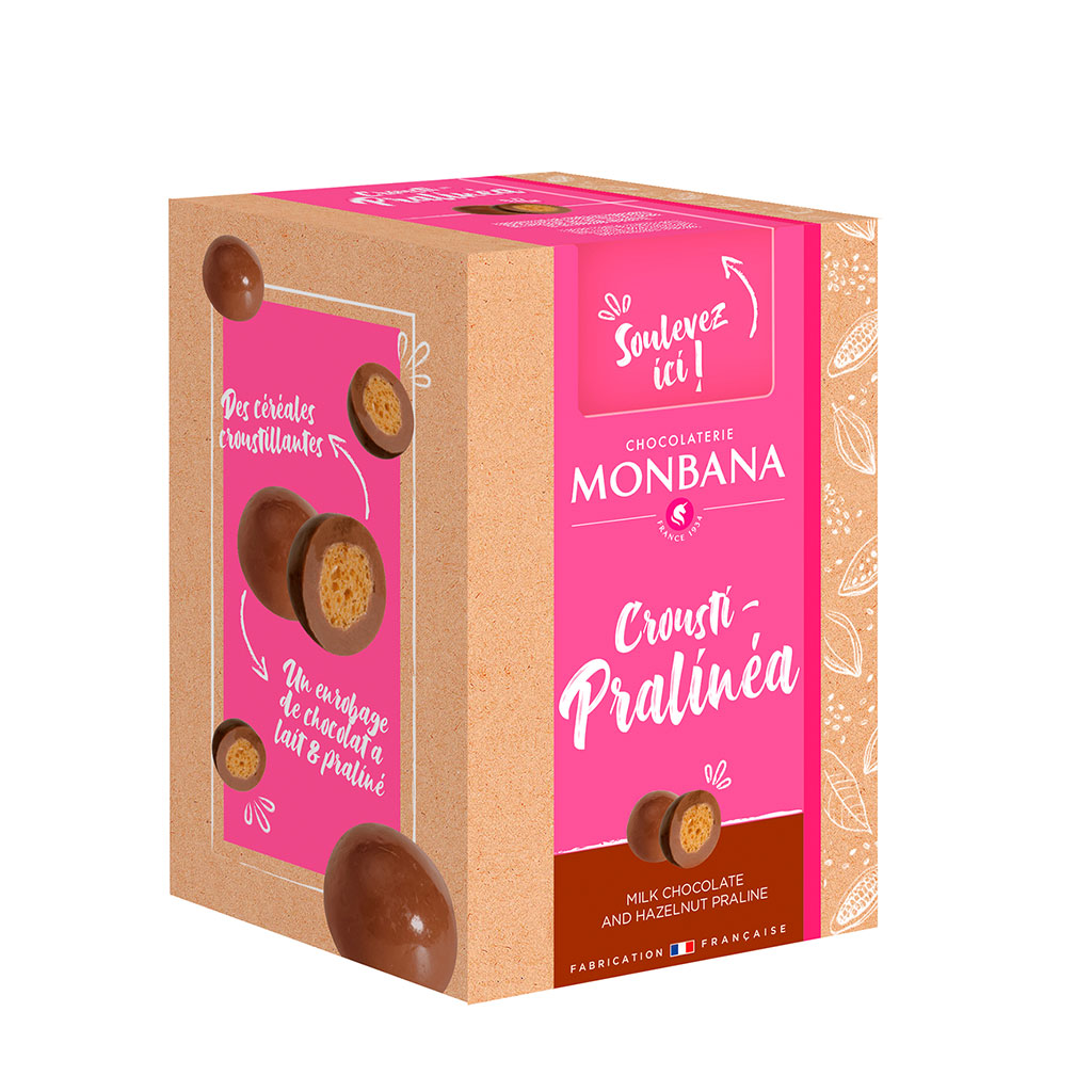 Découvrez notre délicieuse Crousti-praliné, une croustille céréalière enrobée d'une irrésistible couche de praliné fondant et de chocolat au lait.